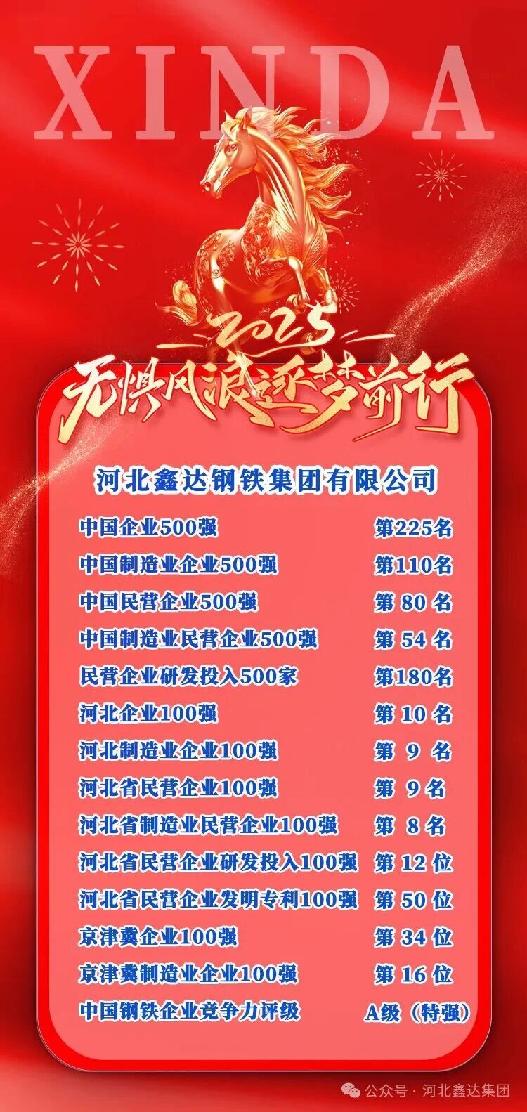 April: Hebei Xinda Iron and Steel Group Co., Ltd. ranked 10th on the Hebei Top 100 Enterprises list and 9th on the Hebei Top 100 Manufacturing Enterprises list.